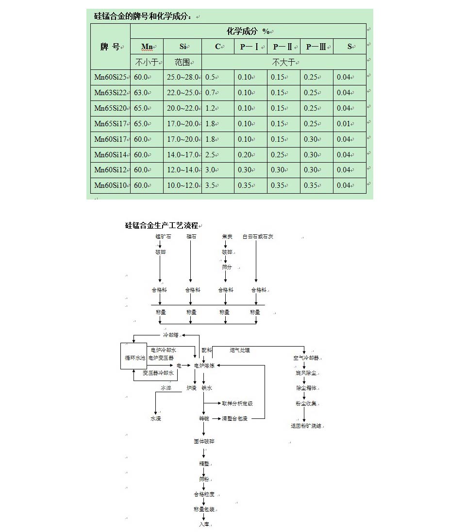 硅錳合金是由錳、硅、鐵及少量碳和其它元素組成的合金,是一種用途較廣、產量較大的鐵合金。硅錳合金是煉鋼常用的復合脫氧劑,又是生產中,低碳錳鐵和電硅熱法生產金屬錳的還原劑。硅錳合金可在大、中、小型礦熱爐內采取連續式操作進行冶煉。 硅錳合金消耗量占電爐鐵合金產品的第二位。硅錳合金里的硅和錳,與氧的親和力較強,在煉鋼中使用硅錳合金,產生的脫氧產物MnSiO3和MnSiO4熔分別是1270℃和1327℃,具有熔點低、顆粒大、容易上浮、脫氧效果好等優點。在相同條件下使用錳或硅單獨脫氧,其燒損率分別是46%和37%,而用硅錳合金脫氧,二者燒損率者是29%。因此,它在煉鋼中得到了廣泛的應用,其產量增長速度高于鐵合金的平均增長速度,成為鋼鐵工業不可缺少的復合脫氧劑和合金加入劑。含碳在1.9%以下的硅錳合金,還是用于生產中低碳錳鐵和電硅熱法金屬錳的半成品。在鐵合金生產企業,通常把煉鋼使用的硅錳合金稱作商品硅錳合金,把冶煉低碳鐵使用的硅錳合金稱作自用硅錳合金,把冶煉金屬用的硅錳合金稱作高硅硅錳合金。錳能與硅組成化合成硅化物MnSiO3、MnSiO和MnSiO3。從硅錳狀態圖中可以看出,穩定的硅化物為MnSi。由于錳的硅化物生成自由能的負值,故遠遠大于錳的碳化物生產自由能的負值,在硅錳合金中含硅量愈高,則含碳量愈低。 硅錳合金都是在礦熱爐中用炭同時還原錳礦石(包括富錳渣)和硅石中的氧化錳和二氧化硅而煉制生產的。硅錳合金生產正常爐況的標志是工作電流穩定,能滿負荷操作,電極下插平衡且較深,電極消耗速度均勻,下放正常,每小時內下放長度在200mm左右,爐眼好開、好堵,出鐵、出渣順暢,溫度高,渣鐵流動性好,易分離。合金成分穩定,爐渣中m(CaO+MgO)/m(SiO2 )在0.7~0.8之間,MnO在10%以下。爐氣成分正常O2小于2%,H2小于8%爐內呈微負壓(—49Pa),爐內溫度低于600℃。